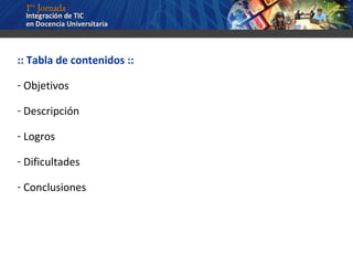 Este documento describe una experiencia de integración de recursos de internet en una asignatura de computación educativa para estudiantes de licenciatura en educación matemática. Los estudiantes crearon y mantuvieron blogs donde publicaron actividades relacionadas con la historia de las matemáticas y su presencia actual usando herramientas como WordPress, Youtube, SlideShare y Movie Maker. El proceso incluyó capacitación en el uso de estas herramientas y evaluación de los productos y procesos de aprendizaje mediante rúbricas.