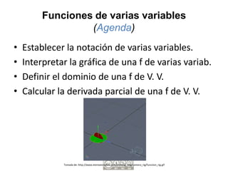El documento presenta una introducción a las funciones de varias variables en el contexto del cálculo para las ciencias biológicas. Explica la notación de funciones de varias variables, cómo interpretar sus gráficas, definir su dominio y calcular sus derivadas parciales.