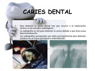 Este documento describe cómo se ven diferentes tipos de caries dental en radiografías, incluyendo caries oclusales, proximales, vestibulares, linguales, de superficie radicular y recidivantes. Explica que las radiografías son útiles para detectar caries debido a que causan desmineralización, y que errores comunes incluyen no reconocer que las caries del esmalte oclusal no son visibles o confundir caries vestibulares con proximales.