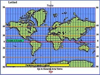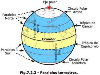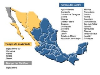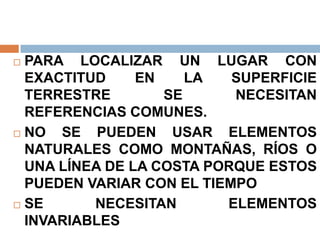 Este documento describe los elementos geográficos utilizados para localizar puntos en la superficie terrestre de manera precisa, como paralelos, meridianos y polos, así como las coordenadas de latitud, longitud y altitud. También explica los husos horarios y cómo México ha adaptado sus husos horarios oficiales a sus límites estatales, adoptando el horario de verano para ahorrar electricidad.