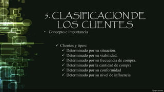 El documento proporciona consejos para brindar una buena atención al cliente, incluyendo mantener un horario correcto, ser amable y cortés, escuchar activamente las inquietudes del cliente y brindar soluciones a sus problemas. Además, define diferentes tipos de clientes basados en su situación, viabilidad, frecuencia de compra, cantidad de compra, conformidad y nivel de influencia.