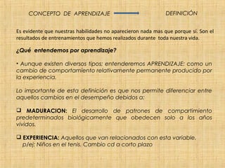 El documento define el concepto de aprendizaje y describe diferentes tipos de aprendizaje como el condicionamiento clásico y operante. El condicionamiento clásico explica cómo los estímulos neutros pueden llegar a desencadenar respuestas condicionadas a través de la asociación con estímulos incondicionados, mientras que el condicionamiento operante describe cómo los refuerzos positivos y negativos pueden modificar el comportamiento voluntario.