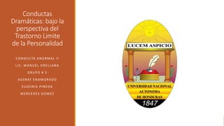 El documento describe el trastorno límite de la personalidad, incluyendo sus características como relaciones interpersonales inestables, comportamientos autodestructivos e impulsivos. Explica que las investigaciones se han centrado en las posibles causas como experiencias familiares negativas en la infancia o vulnerabilidades genéticas. También cubre los síntomas clínicos y los tratamientos recomendados como terapias conductuales, cognitivas y medicamentos.