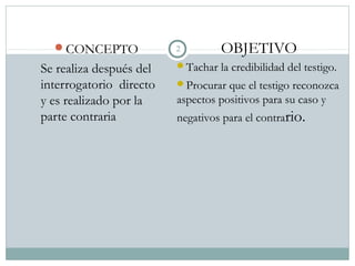 Este documento describe el concepto, objetivo y límites del contrainterrogatorio. El contrainterrogatorio se realiza después del interrogatorio directo y tiene como objetivo cuestionar la credibilidad del testigo y procurar que reconozca aspectos positivos para el caso del abogado que realiza el contrainterrogatorio y negativos para la otra parte. Está limitado a las áreas cubiertas en el interrogatorio directo y a cuestiones relacionadas con la credibilidad del declarante.