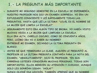 El documento presenta cinco historias cortas que enseñan lecciones de vida importantes. La primera historia enseña la importancia de conocer el nombre de todas las personas, incluso aquellas que limpian. La segunda historia trata sobre ayudar a otros sin esperar nada a cambio. La tercera historia enseña sobre no juzgar a otros prematuramente. La cuarta historia trata sobre aprovechar las oportunidades que se presentan al enfrentar obstáculos. La quinta y última historia enseña sobre la importancia de donar sangre para salvar