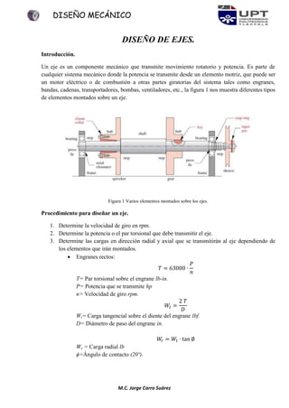El documento describe el proceso de diseño de ejes. Explica cómo determinar la velocidad de giro, potencia, cargas radiales y axiales de los elementos montados en el eje como engranes, poleas y sprockets. También cubre cómo analizar los puntos críticos del eje para determinar los diámetros mínimos, seleccionar materiales y especificar las dimensiones finales del eje.