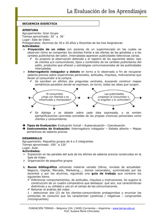 Este documento presenta un plan de clase interdisciplinario para estudiantes de 5to año sobre educación del consumidor. El plan incluye objetivos, actividades y criterios de evaluación. Las actividades involucran el análisis de mensajes publicitarios, la discusión sobre la influencia de la publicidad, y la creación de mensajes para promover la libertad del consumidor. La evaluación se basa en la participación crítica, el trabajo en grupo y la demostración de pensamiento independiente.