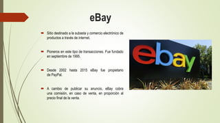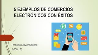 Este documento presenta 5 ejemplos exitosos de comercios electrónicos: eBay (pionero en subastas en línea), Amazon (minorista en línea diversificado), Dell (vendedor líder de computadoras con un e-commerce optimizado), ThinkGeek (vendedor en línea de gadgets y electrónica), y Alibaba (consorcio chino líder en comercio electrónico B2B y B2C).