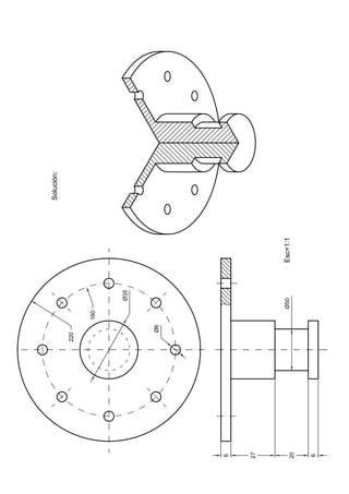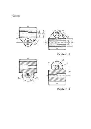 Este documento presenta varios ejercicios de dibujo técnico que involucran el diseño y representación de piezas mecánicas. Los ejercicios requieren que los estudiantes representen piezas a través de vistas normalizadas, aplicando normas de dibujo técnico como cortes y acotaciones, y también incluyen la representación de las piezas en perspectiva. El documento provee instrucciones detalladas sobre los requisitos de cada ejercicio y ejemplos de soluciones pasadas para guiar a los estudiantes.