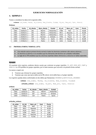 El documento presenta 7 ejemplos de tablas relacionales y describe los pasos para normalizar cada una hasta la tercera forma normal. Esto incluye identificar grupos repetidos y columnas dependientes de otras columnas para dividir las tablas originales en tablas más pequeñas y específicas que eliminan redundancias y anormalidades.