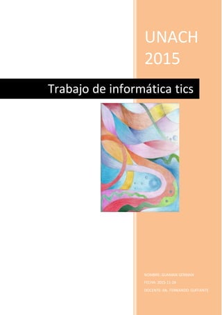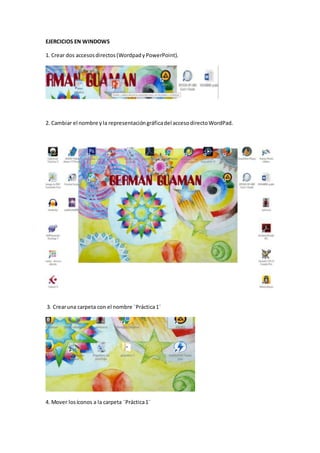 Este documento presenta una lista de 21 ejercicios realizados en Windows como parte de un trabajo de informática. Los ejercicios incluyen crear accesos directos, carpetas y gadgets; ordenar ventanas; configurar la barra de tareas, el protector de pantalla y los fondos; y cambiar la resolución y organización del escritorio. El objetivo general era practicar diferentes funciones y configuraciones básicas en Windows.