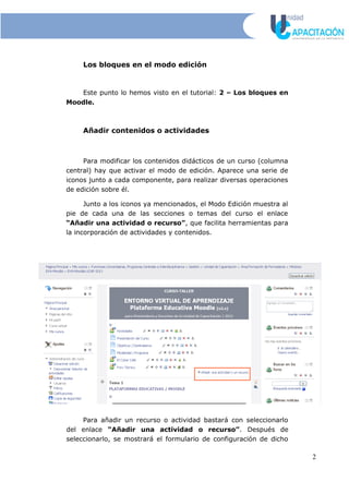 El documento explica las herramientas del modo edición en Moodle, que permiten a los profesores configurar y editar cursos. Al activar el modo edición, aparecen iconos que permiten añadir contenido, editar elementos, mover y eliminar bloques y temas, y configurar la visibilidad y permisos. El modo edición facilita la creación y gestión de cursos en Moodle de forma flexible.