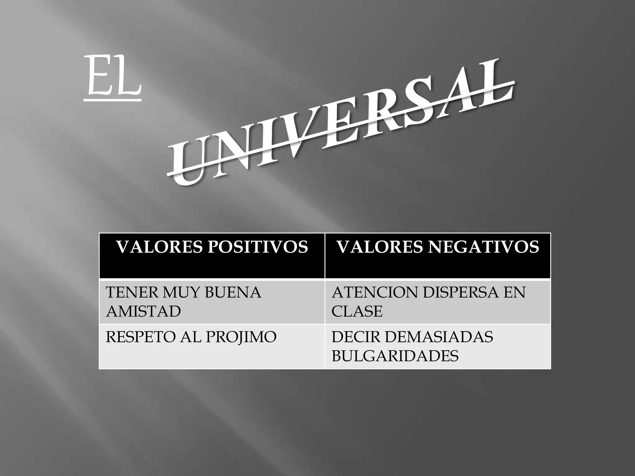 El documento lista valores positivos y negativos, así como buenos y malos hábitos para varios estudiantes. Entre los valores positivos se encuentran tener buena amistad, respeto al prójimo, mientras que entre los negativos están la atención dispersa en clase y decir demasiadas vulgaridades. Los buenos hábitos incluyen puntualidad, responsabilidad e higiene, mientras que los malos hábitos son atención dispersa, trabajos inconclusos y mal desempeño escolar.