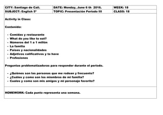 El primer documento resume una clase de inglés de quinto grado sobre temas como comidas, números, familias y profesiones. Los estudiantes deben responder preguntas sobre las personas que los rodean y sus familias. El segundo documento cubre una clase sobre comidas y restaurantes donde los estudiantes deben crear una historieta de una visita a un restaurante y aprenderla.