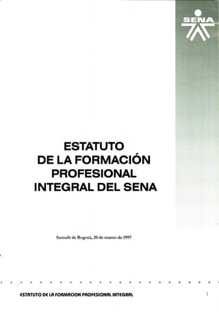 Este documento presenta el Estatuto de la Formación Profesional Integral del Servicio Nacional de Aprendizaje (SENA) de Colombia. El Estatuto define el concepto, principios y procesos de la formación profesional integral que ofrece el SENA de acuerdo con su misión legal de capacitar a los trabajadores colombianos. El Estatuto también examina las relaciones entre la formación profesional, la tecnología, el mercado laboral y la educación.