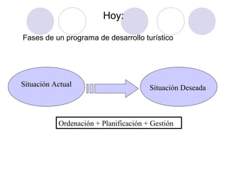 El documento describe las fases de un programa de desarrollo turístico. Incluye una fase de análisis de la legislación y modelo de gestión, una fase de inventario de recursos, y una fase de evaluación y diagnóstico que incluye análisis interno y externo. Luego describe las siguientes fases de formulación de estrategias, implementación, comercialización, instrumentación del modelo de gestión, y retroalimentación.