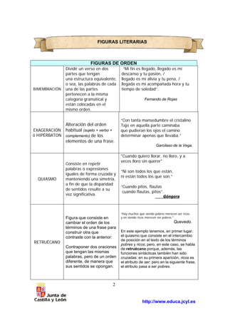 Este documento explica diferentes figuras literarias que los escritores pueden utilizar para expresar sus ideas de manera más fuerte y bella. Describe figuras de orden, repetición, significado y otras variaciones del lenguaje poético.