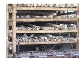 El documento describe el modelo de un núcleo productivo de la guadua en la cuenca hidrográfica del río Guadalajara en Buga, Colombia, que busca fortalecer la cadena productiva de la guadua mediante la concentración de actividades productivas y comerciales. Destaca las problemáticas actuales, como la desconexión entre los actores de la cadena y la falta de manejo técnico, así como la necesidad de implementar tecnologías y estrategias sostenibles. Además, proporciona un análisis detallado del estado actual de los guaduales, su madurez y productividades, y la demanda de materia prima para la transformación industrial y artesanal.