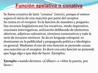 El documento describe las diferentes funciones del lenguaje, incluyendo la función apelativa o conativa que se centra en causar una reacción en el receptor, la función referencial que tiene como objetivo informar de manera objetiva y unívoca, y la función emotiva o expresiva que permite al emisor exteriorizar sus sentimientos y actitudes.