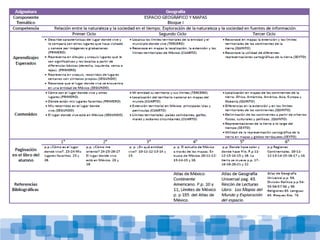 El documento describe el proceso de reorganización curricular de la asignatura de Geografía. El equipo de trabajo integró contenidos y aprendizajes esperados por ciclo y organizó la información en bloques temáticos de cinco bimestres. El formato final incluye ejes temáticos, competencias, contenidos y aprendizajes esperados por ciclo para facilitar su uso por los docentes.