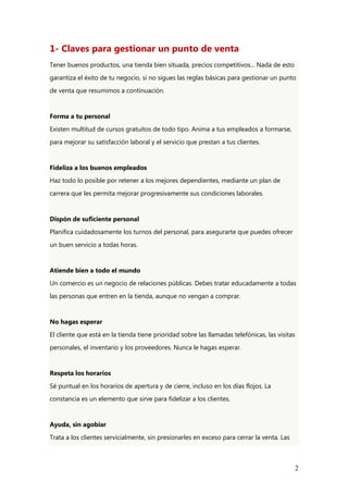 Este documento ofrece consejos para la gestión básica de una tienda. En primer lugar, habla sobre la importancia de formar al personal, fidelizar a los buenos empleados y disponer de suficiente personal. También enfatiza tratar bien a todos los clientes, no hacerles esperar y respetar los horarios. Luego, cubre temas como el merchandising externo e interno, incluyendo consejos sobre el rótulo, escaparate, distribución de productos y más. El objetivo general es atraer y retener clientes de manera profesional.
