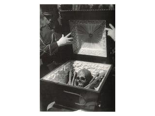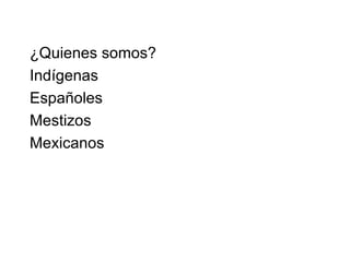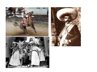 El documento describe aspectos de la identidad mexicana a partir de la Revolución Mexicana, incluyendo estereotipos del mexicano tradicional y la influencia del náhuatl en el idioma español. También resume la historia de importantes figuras de la independencia como Hidalgo, Morelos y Zapata, así como la construcción de monumentos como la Columna de la Independencia y el Monumento a la Revolución para conmemorar a estos héroes.