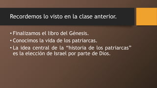 El documento resume el libro del Éxodo, notando que se enfoca en la relación entre Dios y el pueblo de Israel, desde la llamada de Moisés hasta la finalización del Tabernáculo. Describe los 430 años que los hebreos pasaron en Egipto antes de ser liberados por Moisés, y cómo el libro relata tanto la salida de Egipto como la entrega de la ley en el Monte Sinaí.