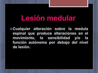 La lesión medular causa alteraciones en el movimiento, la sensibilidad y/o la función autónoma por debajo del nivel de lesión. Afecta principalmente a adultos jóvenes entre 16-30 años, y es más común en hombres que en mujeres. Las causas más frecuentes son accidentes automovilísticos, caídas y lesiones laborales. El diagnóstico se realiza mediante radiografías, resonancia magnética y tomografía computarizada. El tratamiento incluye inmovilización, esteroides, cirugía y re