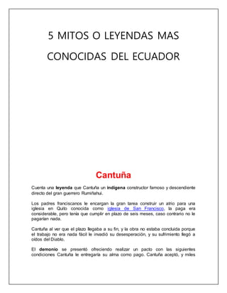 Este documento presenta resúmenes de 5 mitos o leyendas conocidas del Ecuador: 1) La leyenda de Cantuña, un constructor indígena que engañó al diablo para salvar su alma. 2) La leyenda del gallo de la catedral que atacó a un hombre borracho que lo insultó. 3) La leyenda de la doncella de Pumapungo que murió de pena al enterarse que mataron a su amante. 4) El mito del Guagua Auca, un demonio que aterra a borrachos. 5)