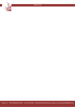 El documento describe varias opciones de localización para una empresa llamada Diamantes Rojos en las ciudades de Consuegra, Madridejos y Tembleque en Toledo, España. Se analizan diferentes parcelas y naves industriales disponibles, considerando factores como el tamaño, servicios, accesibilidad y costo. Finalmente, la empresa elige una parcela en el polígono industrial de Madridejos por ajustarse mejor a sus necesidades de espacio a un costo favorable y ubicación cercana a los socios. También incluye un borrador de contrato para la comp