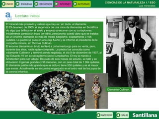 El documento describe el descubrimiento y la historia del Diamante Cullinan, el diamante más grande que se ha encontrado. Fue descubierto en una mina de diamantes en Sudáfrica en 1905. Pesaba 3,106 quilates en bruto. Después de ser tallado, produjo 9 grandes gemas y 96 más pequeñas, con un peso total de 1,064 quilates. La gema más grande tallada fue de 530 quilates y se encuentra actualmente engarzada en el cetro real de la corona británica.