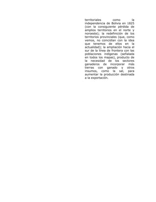 El documento describe los acontecimientos políticos y territoriales en las provincias del Virreinato del Río de la Plata entre 1820 y 1825. Tras la independencia de Bolivia en 1825, las provincias declararon su autonomía y soberanía de forma gradual. Se formaron nuevas provincias y hubo conflictos entre facciones unitarias y federales. Mientras tanto, los países vecinos como Brasil, Perú y Chile también luchaban por su independencia de España.