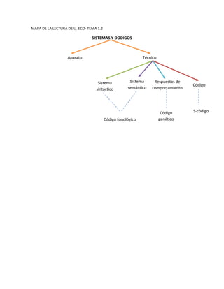 Este diagrama muestra los diferentes sistemas y códigos involucrados en la lectura. En la parte superior se encuentran los sistemas sintáctico y semántico, que procesan el significado de las palabras y oraciones. Debajo se encuentran los códigos fonológico, genético y de comportamiento, que permiten la comprensión y respuesta a lo leído.