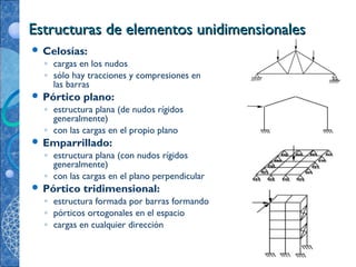 Este documento describe los métodos matriciales para el análisis de estructuras de elementos unidimensionales. Explica los conceptos clave como los grados de libertad, las matrices de rigidez y flexibilidad, y cómo se pueden modelar diferentes tipos de estructuras como pórticos, celosías y emparrillados usando este enfoque. También cubre temas como la discretización, los sistemas de referencia global y local, y cómo se definen y calculan los términos de las matrices de rigidez elementales.