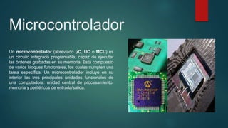 Este documento describe varios componentes electrónicos como microcontroladores, módulos de joystick, sensores infrarrojos, detectores de gotas de agua y tipos de baterías. Explica que un microcontrolador es un circuito integrado programable que incluye una unidad central de procesamiento, memoria y periféricos de entrada/salida. También describe que un módulo de joystick proporciona control analógico en dos ejes y un interruptor digital, y que un sensor infrarrojo puede medir la radiación infrarroja emitida por los cuer