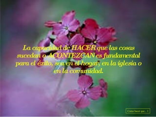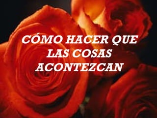 El documento ofrece consejos sobre cómo lograr que las cosas sucedan. Recomienda visualizar el resultado deseado, planificar los detalles de implementación, involucrarse completamente en el proyecto con entusiasmo, concentrarse en los puntos fuertes, comunicarse claramente, resolver problemas en lugar de enfocarse en ellos, crear condiciones favorables, mantener la calma y confiar en que las cosas sucederán.