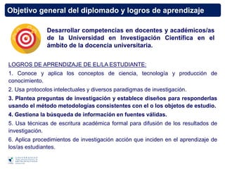 El diplomado se enfoca en desarrollar competencias en docentes universitarios para la investigación científica en la docencia. Los estudiantes aprenden a plantear preguntas de investigación, utilizar metodologías y gestionar información de fuentes académicas. Se abordan temas como el método científico, bases de datos y medición del impacto científico a través de indicadores bibliométricos.