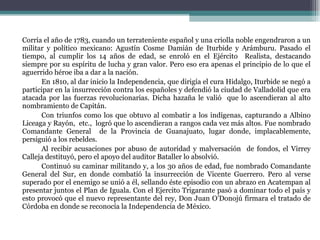 Agustín de Iturbide nació en 1783 en México y se unió al ejército realista español. Inicialmente luchó contra los insurgentes durante la guerra de independencia de México, pero luego se unió a ellos y jugó un papel clave en la independencia de México como líder del Ejército Trigarante. Fue nombrado emperador de México en 1822 pero fue derrocado un año después y obligado a exiliarse; regresó en 1824 y fue ejecutado.