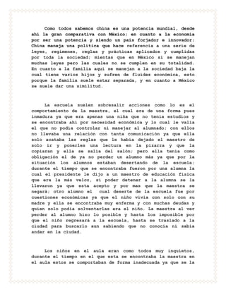 Este documento resume la película "Ni uno menos" sobre una maestra joven que se hace cargo de una escuela rural en China. La maestra lucha por mantener a los estudiantes en la escuela a pesar de carencias económicas y otros desafíos. Usa estrategias creativas como enseñar matemáticas a través de cuentas para motivar a los estudiantes. La película destaca las diferencias entre contextos rurales y urbanos, y es recomendada para futuros maestros.