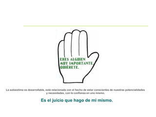 Este documento presenta 5 pasos para elevar la autoestima. El primer paso es el autoconocimiento, identificando eventos que han afectado la autoestima. El segundo paso es adoptar pensamientos positivos. El tercer paso es identificar el autoconcepto en diferentes roles sociales. El cuarto paso es establecer metas. Y el quinto paso es desarrollar la resiliencia para aprender de las dificultades.