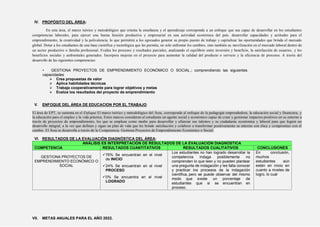 Este documento resume la planificación anual de un curso de Educación por el Trabajo en una escuela secundaria. Los estudiantes provienen de familias dedicadas a la agricultura y comercio en una región turística de Perú. El objetivo es desarrollar competencias laborales y empresariales. La meta es que el 24% de estudiantes logren la competencia de gestión de proyectos al final del año, a través de experiencias de aprendizaje prácticas sobre temas como electricidad, agua y medio ambiente.