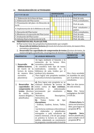 El documento presenta un plan lector para el quinto grado de una institución educativa. Incluye una línea base diagnóstica, objetivos, programación de actividades, estrategias y selección de textos. El plan busca desarrollar hábitos lectores en los estudiantes y mejorar su comprensión lectora a través de la lectura regular de textos seleccionados y actividades como cuentacuentos.