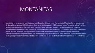 Este documento presenta resúmenes de 5 playas populares en Ecuador: Montañitas, Olón, Salinas, Santa Elena y Ballenita. Montañitas es un pequeño pueblo costero que se hizo famoso como destino de surf y ahora es popular entre surfistas de todo el mundo. Olón tiene más de 3 km de playa y el Santuario Blanca Estrella de la Mar. Salinas es conocida como el "Paraíso Azul del Pacífico Sur" y es el balneario más importante del país. Santa Elena incluye playas como Ballenita, Montañitas y Olón
