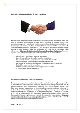El documento describe el modelo de las 5 fuerzas de Porter, que identifica 5 fuerzas competitivas que afectan la rentabilidad de una industria: 1) amenaza de nuevos competidores, 2) poder de negociación de los proveedores, 3) poder de negociación de los compradores, 4) amenaza de productos sustitutos, y 5) rivalidad entre los competidores existentes. Luego, se explican cada una de las 5 fuerzas y los factores que las componen.