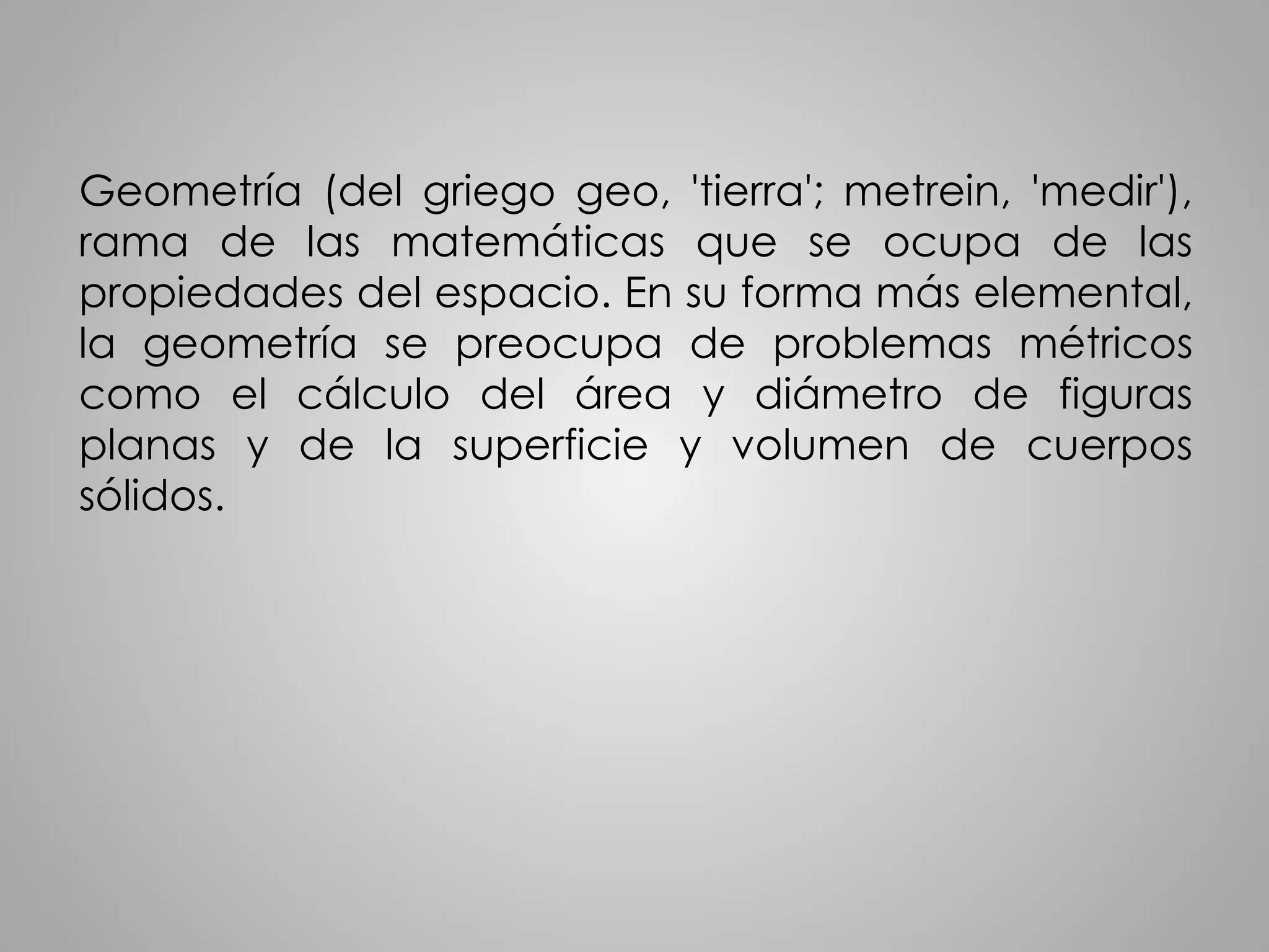 Este documento trata sobre conceptos básicos de geometría. Explica figuras geométricas como el punto, el triángulo, el cuadrado y el círculo. También menciona polígonos como el pentágono y el hexágono. Además, habla sobre matemáticos griegos fundacionales como Euclides y Tales de Mileto y sus contribuciones a la geometría.
