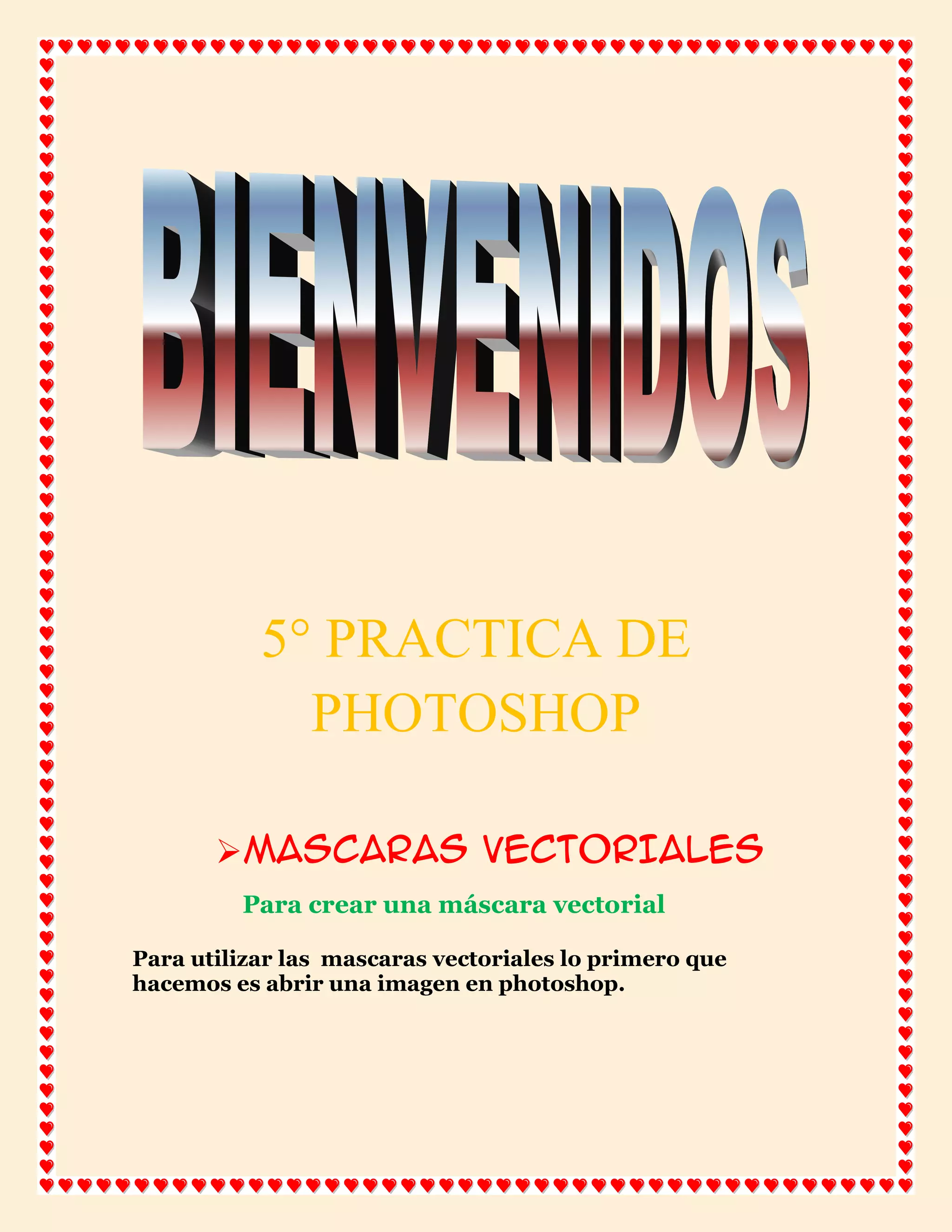 El documento describe cómo crear máscaras vectoriales, combinar imágenes y crear panoramas en Photoshop. Para crear una máscara vectorial, se convierte la imagen en capa regular y se oculta todo con una máscara vectorial antes de revelar partes con la herramienta elipse. Para combinar imágenes, se añaden capas nuevas y se mueven las imágenes. Para crear panoramas, la herramienta Photomerge une múltiples imágenes automáticamente.