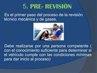 La pre-revisión es el primer paso del proceso de inspección técnico-mecánica y de gases de un vehículo. Se realiza para determinar si el vehículo cumple con las condiciones mínimas para iniciar el proceso e incluye la verificación del tipo de vehículo y su identificación con documentos como la licencia de tránsito y el SOAT. El vehículo debe presentarse limpio y sin tapacubos para facilitar la inspección.