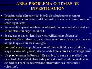 1) El documento describe los pasos para definir un problema de investigación, incluyendo identificar un área problema, delimitar el problema, y formularlo de manera que especifique las variables y la población a estudiar.