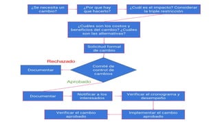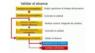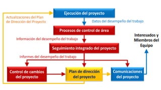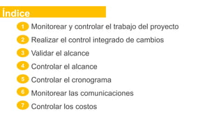 El documento describe los procesos de monitoreo y control en la gestión de proyectos, abarcando la vigilancia y regulación del progreso en diversas áreas como el alcance, cronograma, costos y comunicaciones. Se enfatiza la importancia de identificar y gestionar los cambios necesarios, así como validar entregables y evitar desviaciones en los planes establecidos. Además, detalla métodos y herramientas para evaluar y asegurar el desempeño del proyecto a lo largo de su ciclo de vida.