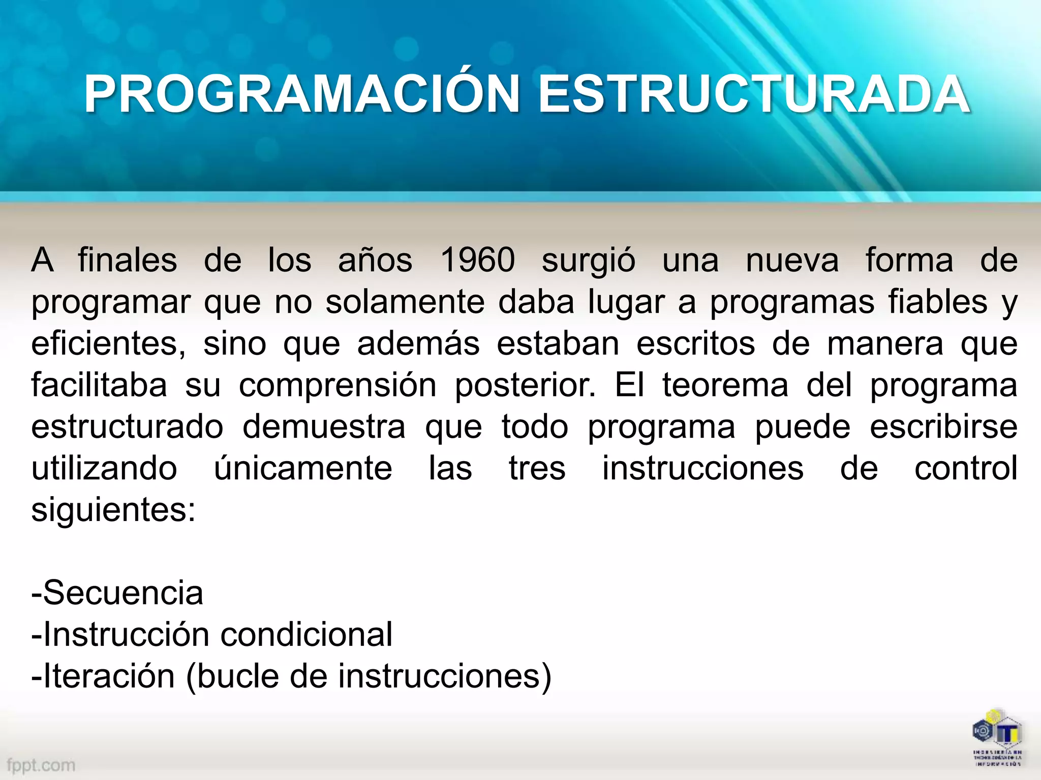 El documento describe la programación estructurada, la cual surgió a finales de los años 1960 como una nueva forma de programar que producía programas fiables, eficientes y fáciles de comprender. La programación estructurada se basa en dividir un problema en subproblemas más pequeños y sencillos mediante técnicas de segmentación y programación modular utilizando procedimientos y funciones.
